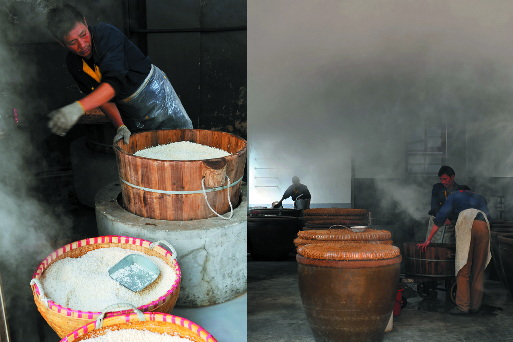 冬釀最關鍵、最神秘的環節非“開耙”莫屬。上好的糯米浸泡之后蒸熟、拌進麥曲,被倒入大缸里開始發酵。發酵過程中缸內原料的溫度會發生微妙變化,當溫度上升過快時,需要釀酒師傅及時干預攪拌冷卻,俗稱“開耙”。其作用是調節發酵醪的溫度,補充新鮮空氣,以利于微生物生長繁殖。開耙技術的好壞關系到成品酒的品質高低,它是整個釀酒工藝中最難控制的關鍵性技術,通常由經驗豐富的老師傅把關。