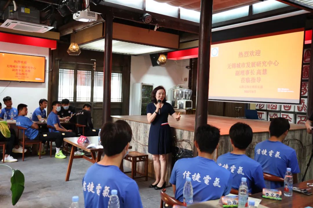 隨后,高慧同隊員們就“創造人生的最大價值”這一話題做了深入的分享和交流,通過生動活潑的事例,分析了中國足球的昨天、今天和明天,并鼓勵球員把模棱兩可的熱愛變成斬釘截鐵的目標,把時間花在讓自己變得更好和追求卓越上。隊員們仔細聆聽、認真筆記。高慧勉勵大家充分凝聚團隊力量,爭取在即將到來的新賽季再創佳績,為無錫這座城市增光添彩。